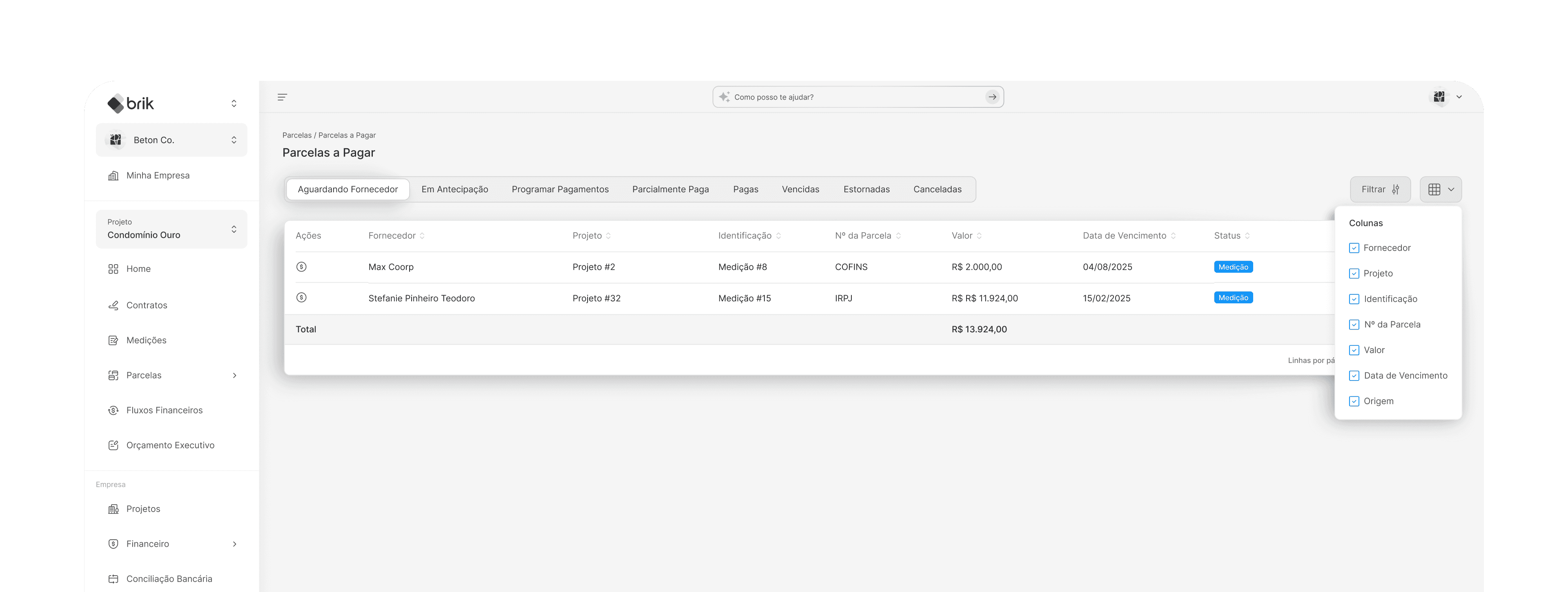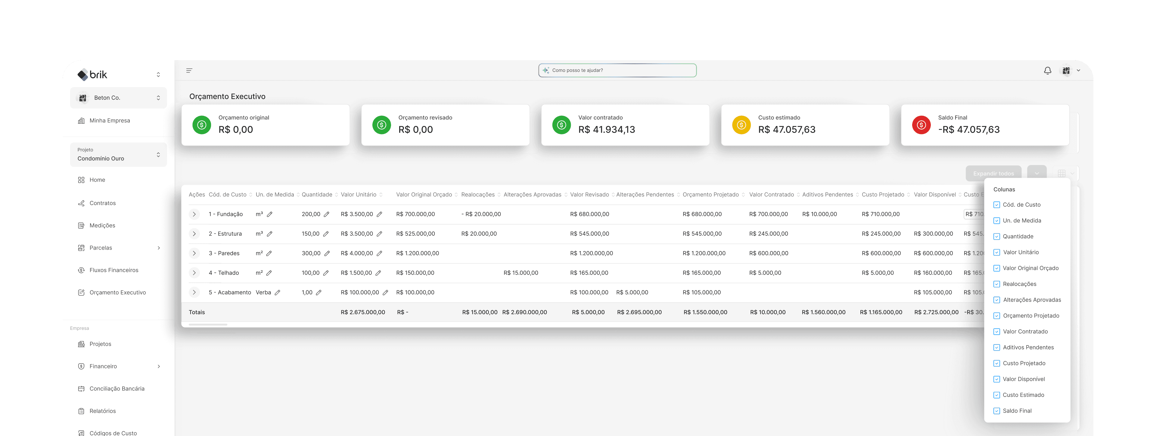Da criação do orçamento até o último pagamento da obra, o Brik oferece todas as ferramentas em um só lugar