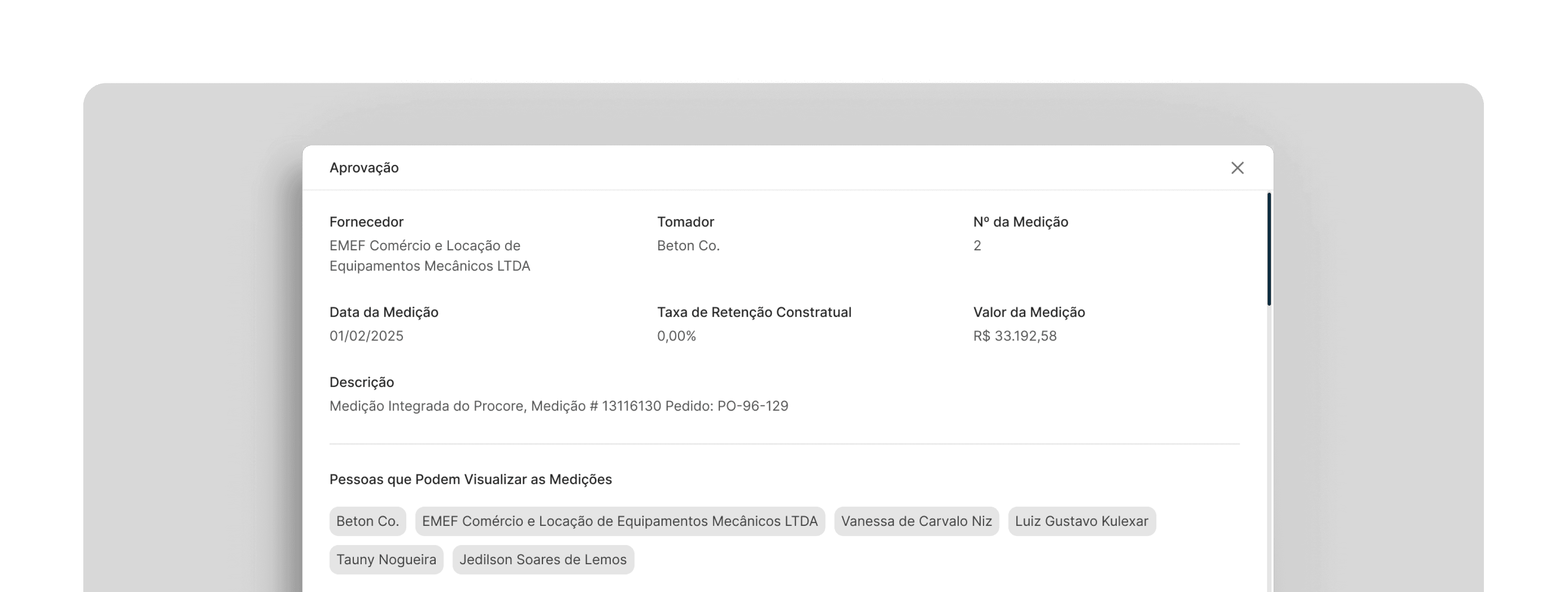 Além disso, impostos retidos e retenções contratuais são realizados automaticamente. Após aprovada, a medição avisa