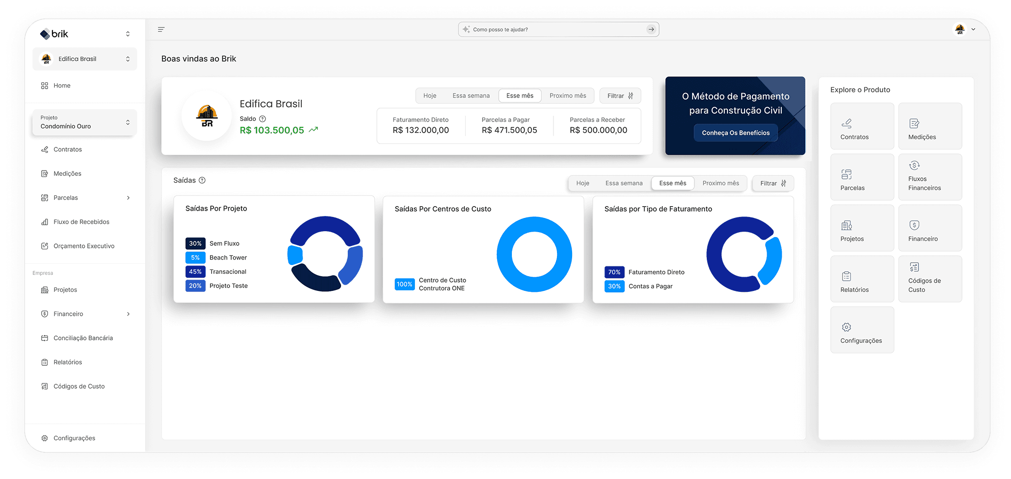 Da criação do orçamento de sua obra até a efetivação do pagamento, o Brik oferece todas as ferramentas em um só lugar.
